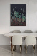 "Asphaltografics" is a series of landscape still life paintings, with the artist's radically new technique based on car tyres, and more recently bicycle tyres. In the Anthropocene Age, the destructive imprint left by the automobile is clearly visible around the globe. For the “Asphaltografics” series, the car tyre becomes a brush: an unorthodox new tool that rolls paint across a canvas. When it is rolled across a surface, floral shapes and plant mutations emerge, thus closing the cycle, at least on a creative level. Converted into stamps, the tyres recreate the nature they have destroyed and flattened. It is not the painter’s handwriting or brushwork that is relevant here, but the imprint of the tyre treads, which are ironically originally modelled on plant structures. For this series, the artist used a watercolour painting by Dürer as a template: his nature study "Great Piece of Turf" from 1503. Panagiotidis questions: "How would Dürer, this realist, have reacted to the changes in our environment? I made four variations of the same theme, with the colour synthesis representing the four seasons."