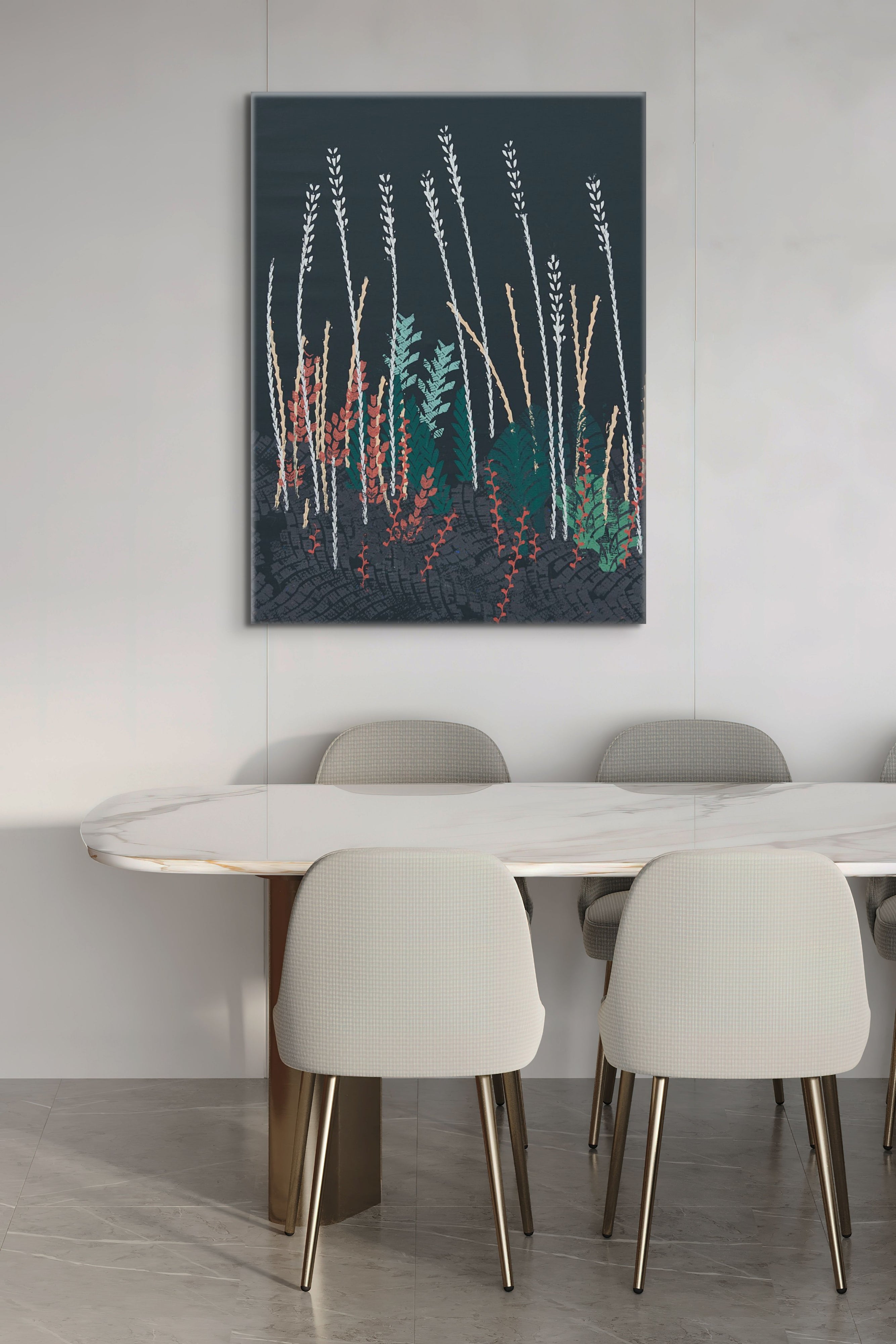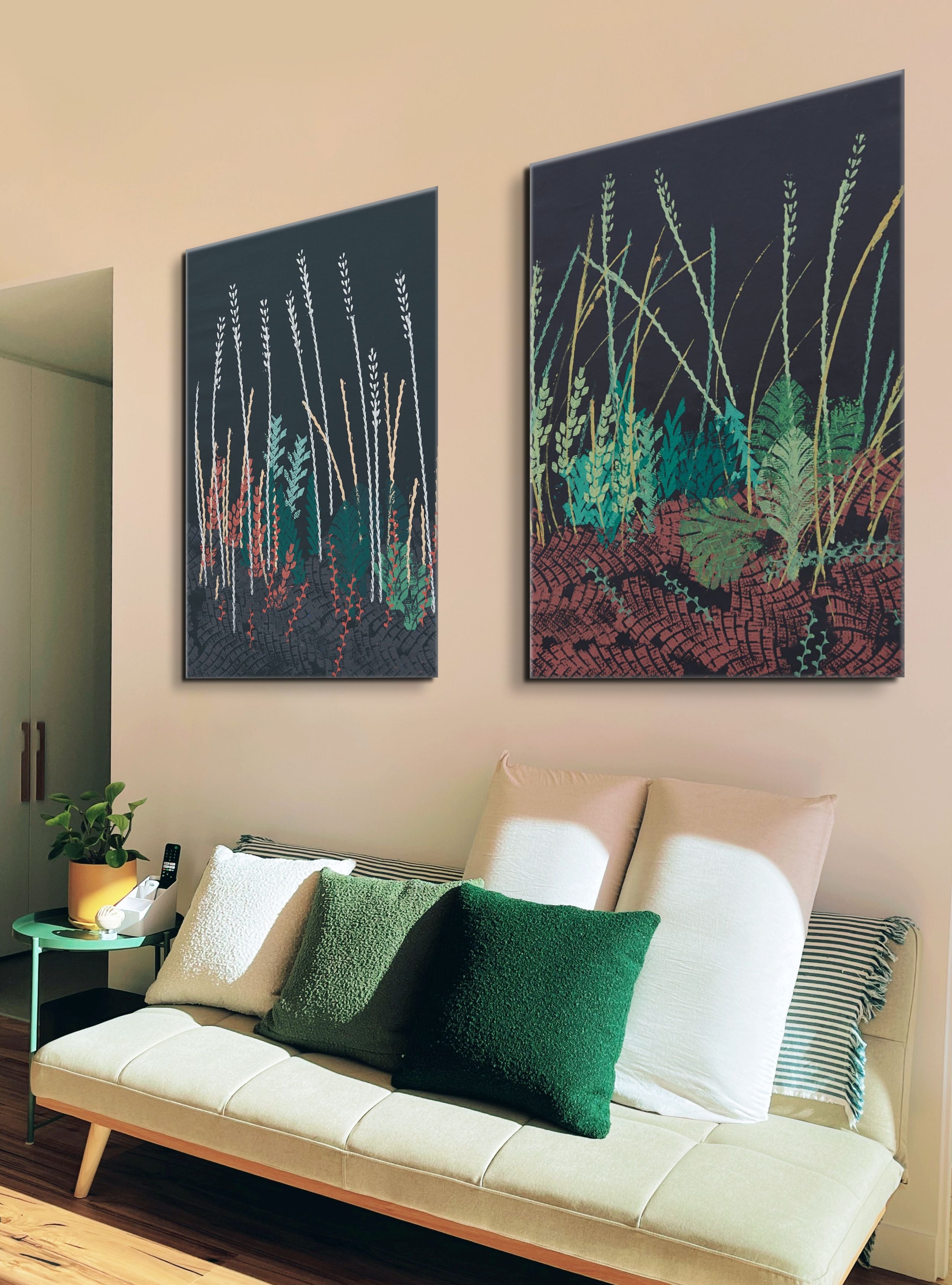 "Asphaltografics" is a series of landscape still life paintings, with the artist's radically new technique based on car tyres, and more recently bicycle tyres. In the Anthropocene Age, the destructive imprint left by the automobile is clearly visible around the globe. For the “Asphaltografics” series, the car tyre becomes a brush: an unorthodox new tool that rolls paint across a canvas. When it is rolled across a surface, floral shapes and plant mutations emerge, thus closing the cycle, at least on a creative level. Converted into stamps, the tyres recreate the nature they have destroyed and flattened. It is not the painter’s handwriting or brushwork that is relevant here, but the imprint of the tyre treads, which are ironically originally modelled on plant structures. For this series, the artist used a watercolour painting by Dürer as a template: his nature study "Great Piece of Turf" from 1503. Panagiotidis questions: "How would Dürer, this realist, have reacted to the changes in our environment? I made four variations of the same theme, with the colour synthesis representing the four seasons."