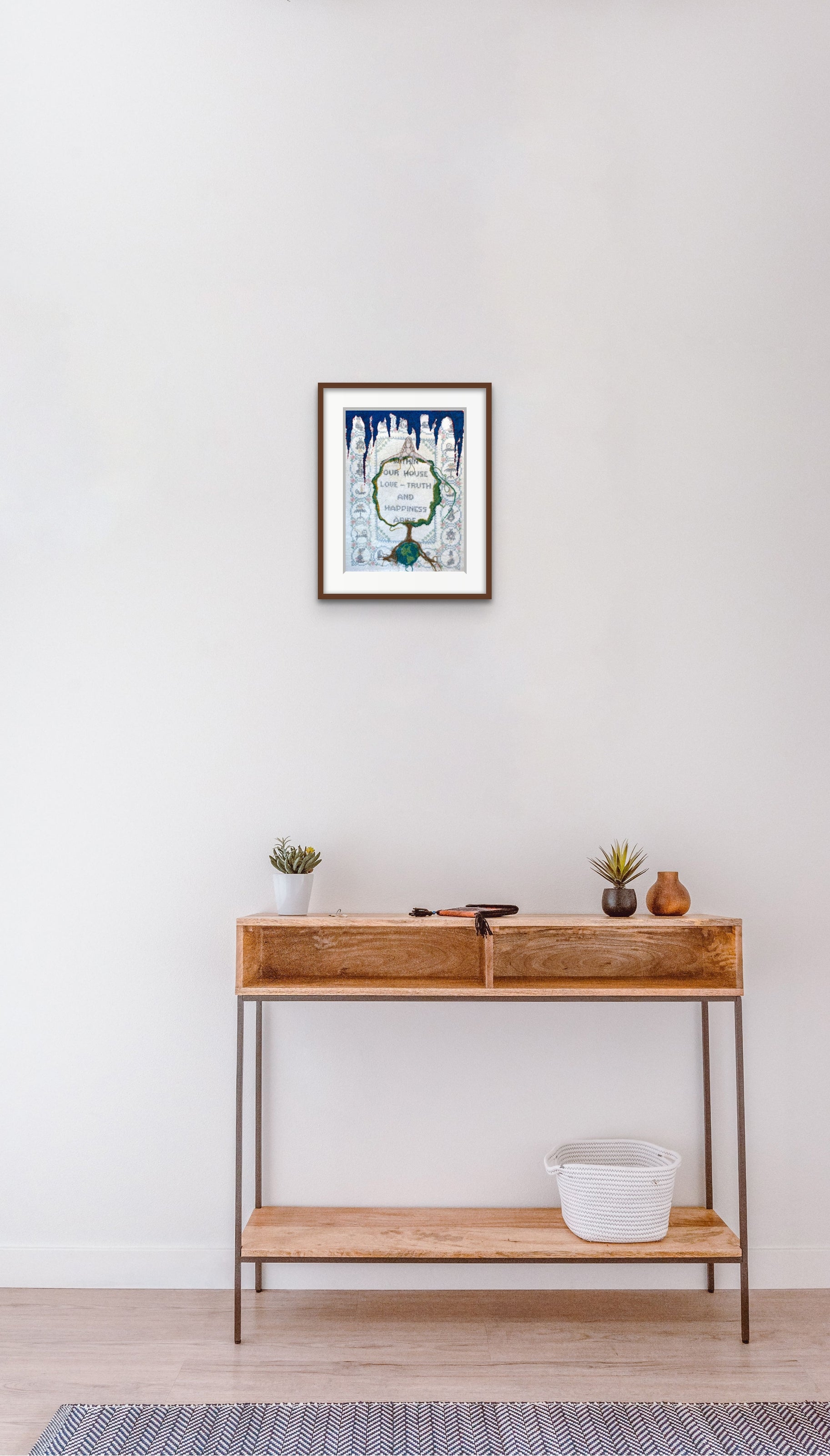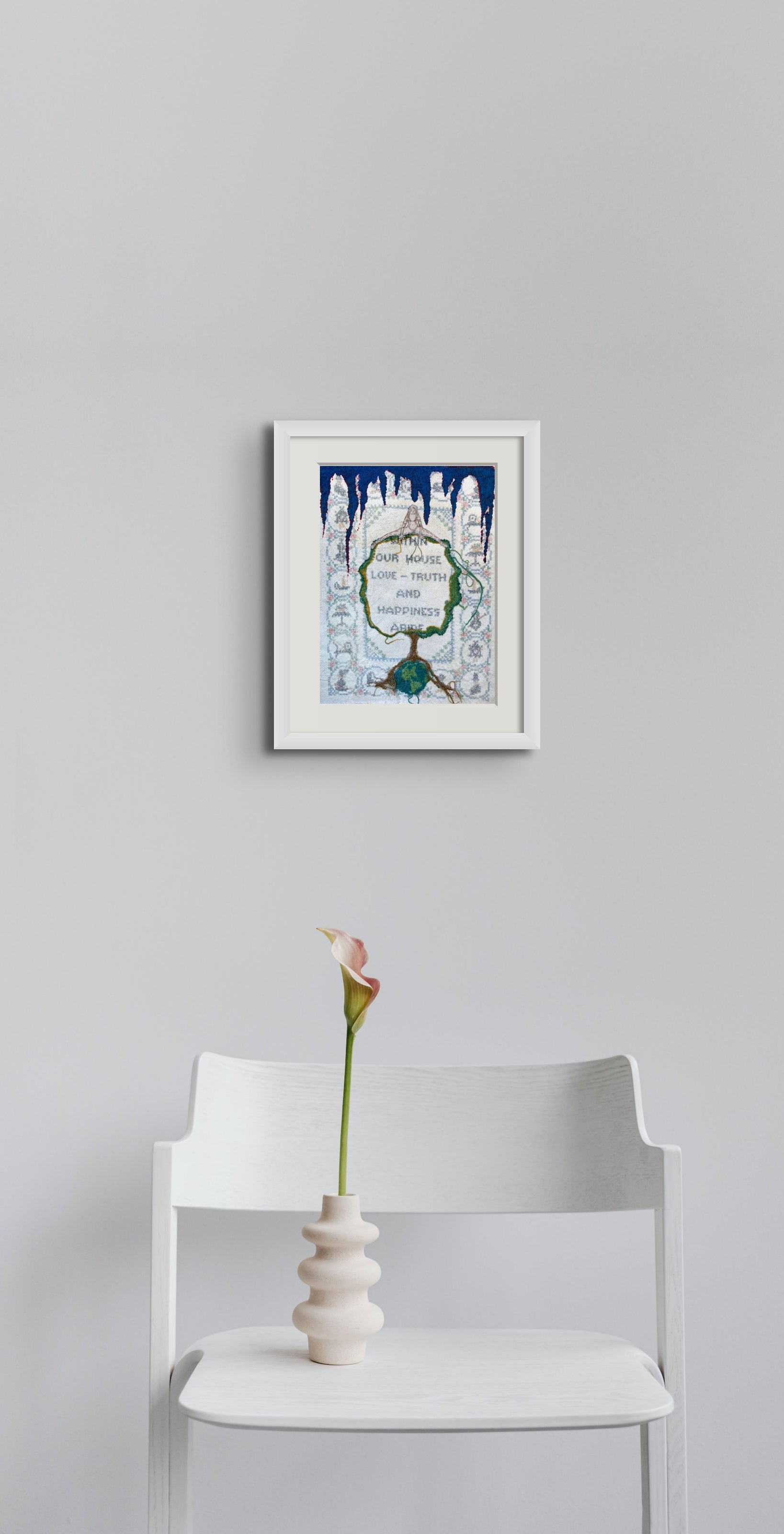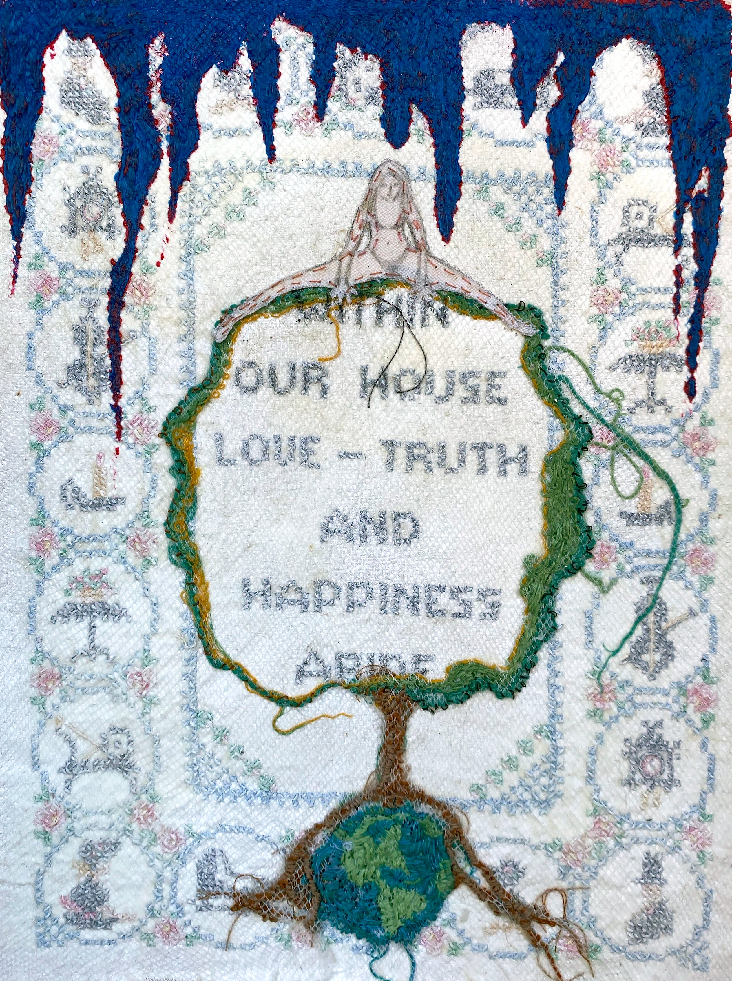 "Years ago amongst my fathers antiques I found a hand stitch embroidery that said "Within Our House Truth and Happiness Abide." For years I saved it and decided to upcycle the embroidery with my own stitching. I imagine that this was a wish someone had, that their home would be a happy place where truth abides. It is my wish for the whole world." - Belinda Chlouber
