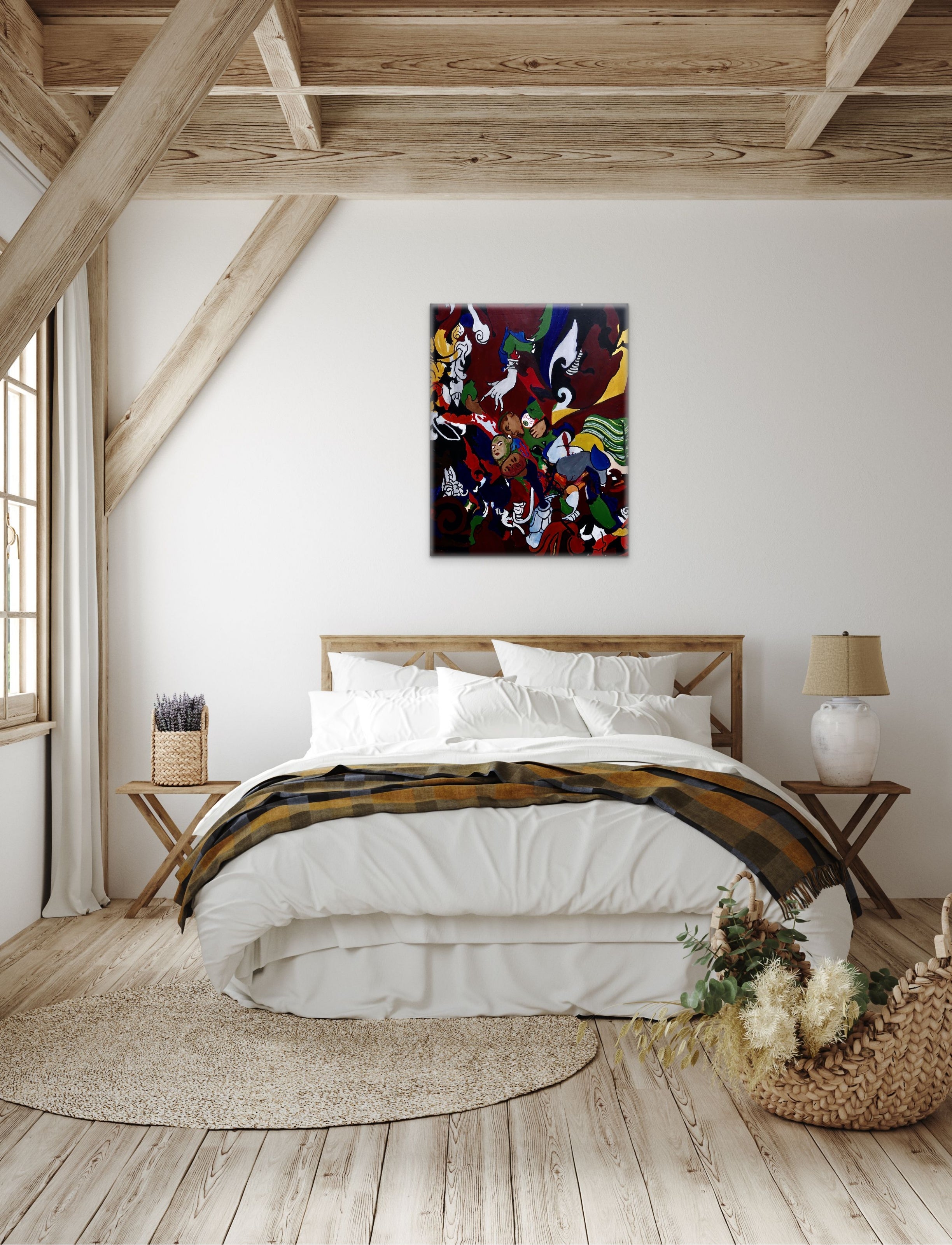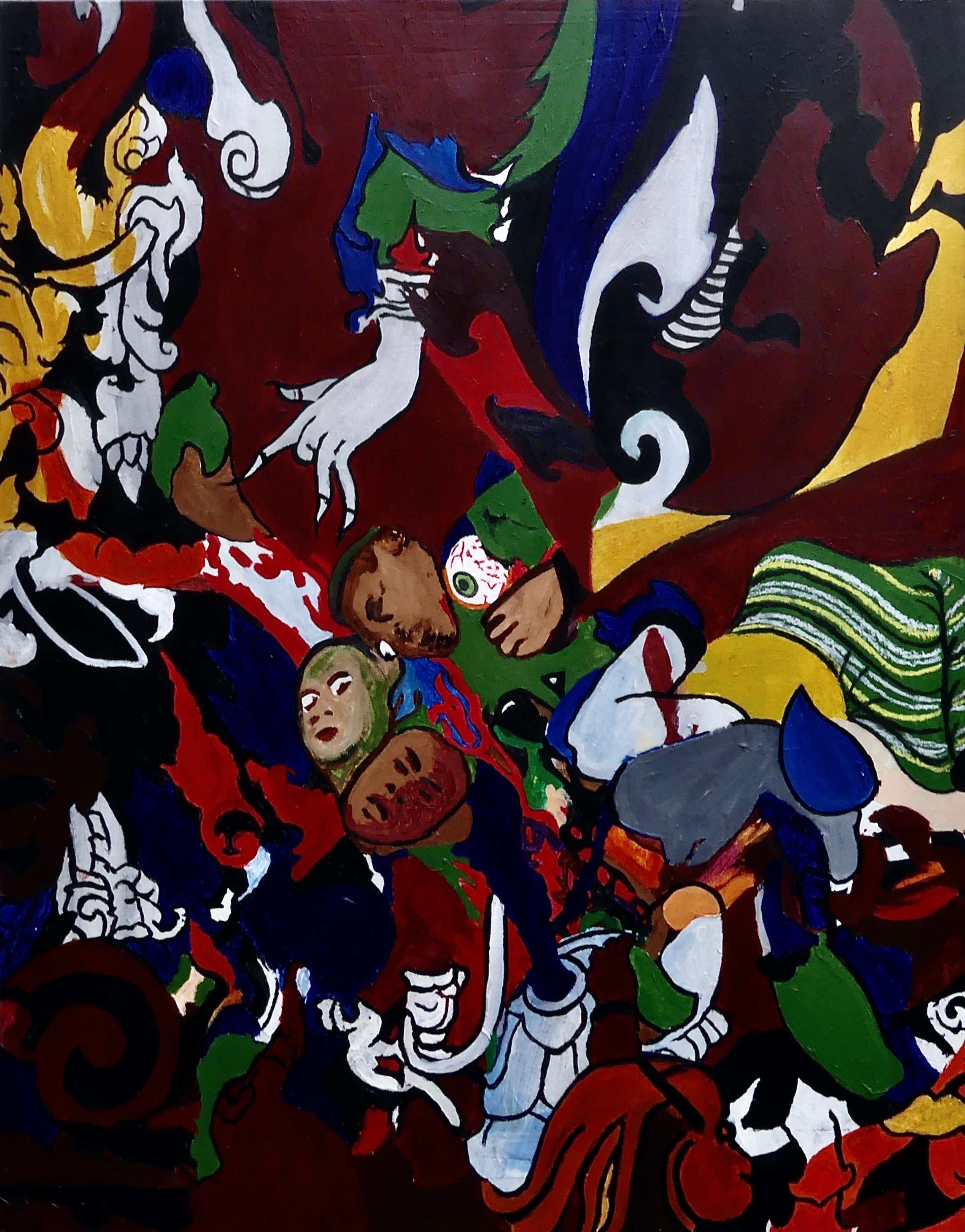 Feb 1st 2021 is acrylic and oil pastel on canvas mirroring the artist’s inner turmoil and reaction to Myanmar 2021 uprising where the military government confronted peaceful protestors and turned the demonstration into bloodshed. As during the coup, the figures are clashing with each other, almost blending into their surroundings and losing their individuality to higher, violent forces and overwhelming chaos.