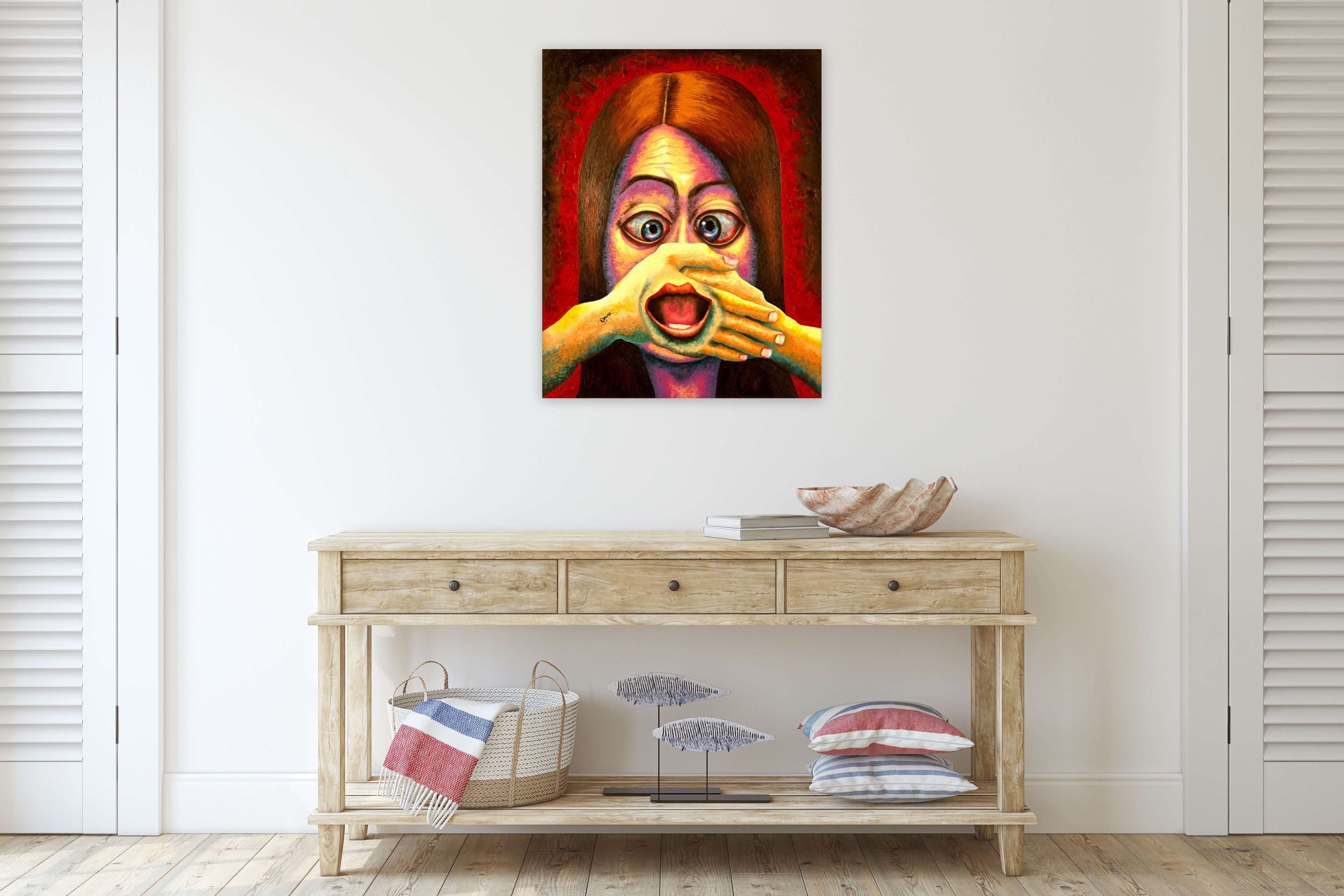 This dazzlingly eye-catching painting is created by the use of the disturbing juxtaposition, commonly used by surrealists, to portray a woman shouting for help. An ant, commonly found in Dali's symbolism for death, decay and as a reminder for mortality, is astutely placed to highlight her despair.