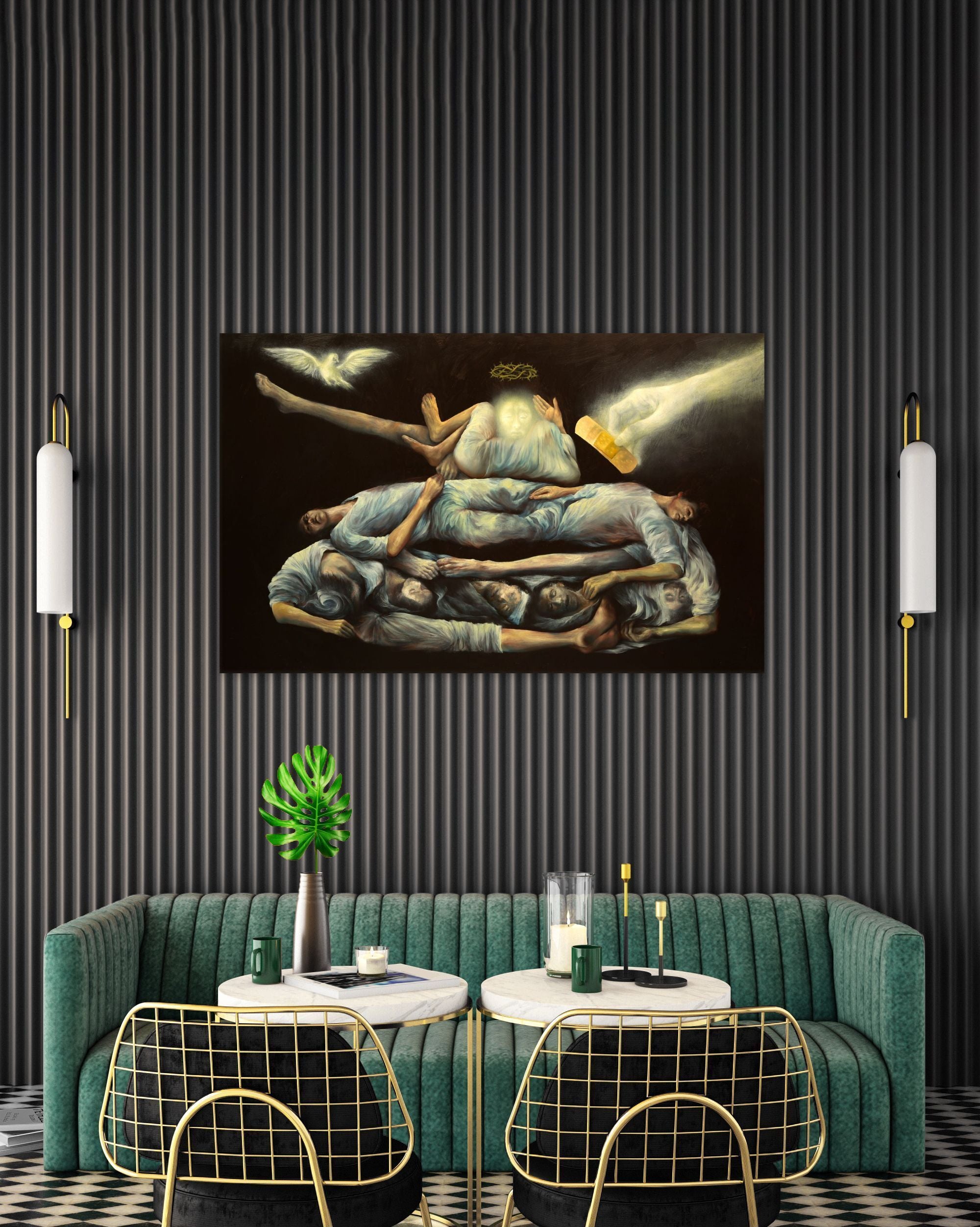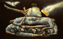 The painting depicts the the Tiananmen Square massacre in 1989. With a grotesque style, it emphasises on the irrational and ridiculous images of bodies piling up, accentuating the horror of the incident. The black backdrop is especially reminiscent of Francisco Goya's Black Paintings which portray fears and the bleak outlook of humanity.
