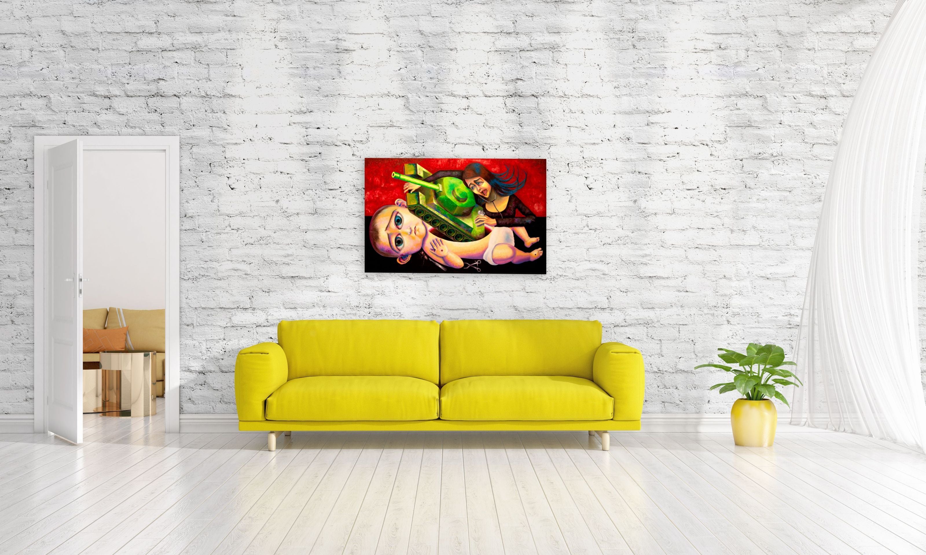 The painting reminds us of famous surrealists' works such as René Magritte and Max Ernst - the unexpected and irrational juxtapositions, dreamlike scenes impeccably capture the woman's pain and sorrow witnessing the baby injured by bullets and a tank.