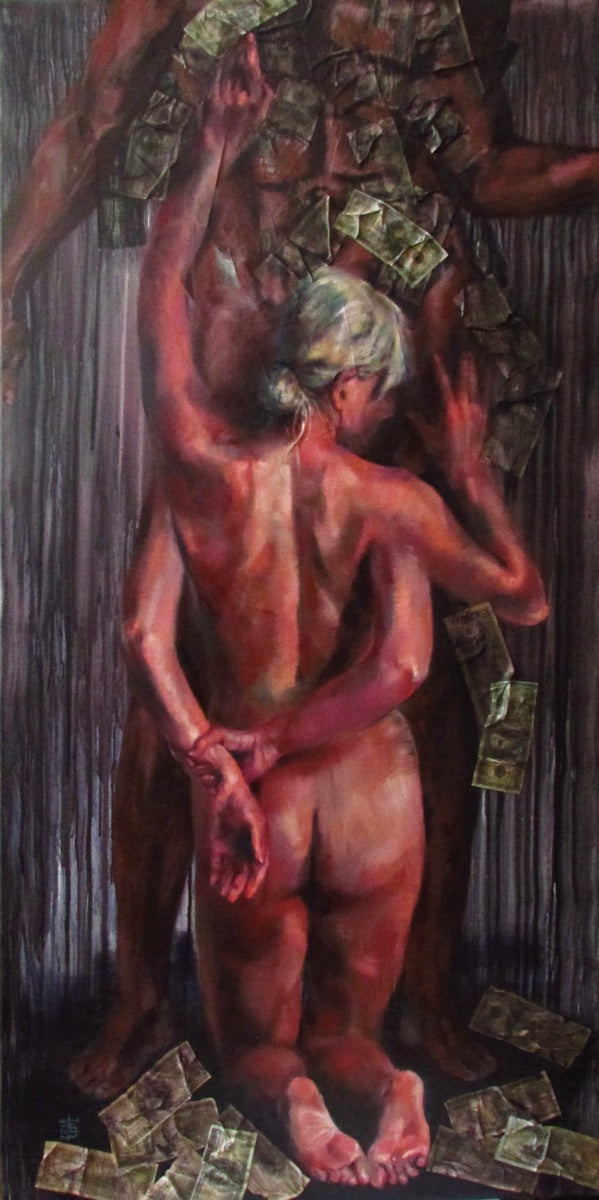 Kateryna Bortsova is a painter and graphic artist with BFA and MFA in graphic arts. Her work is eclectic, exploring issues of modernity, migration and economics. Seemingly interested by the philosophy behind social and cultural standards, Bortsova's work plays a crucial part in communicating her perception of reality. Since Russia invaded Ukraine, Bortsova had to leave her home town and escape to Germany. This experience heavily informed her work and view on society - especially with her practice continuing during the two months of shelling within Ukraine before she left.