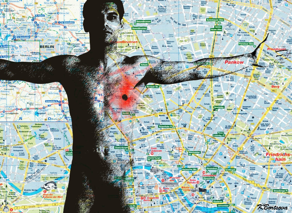 This piece is part of a project based on the artist's term "Movement = Change". This is an understanding of the changes in social environments, a person's place in a modern city; stratification and layering of various cultural, social changes. In addition, the project touches upon topics related to the pandemic, border closures and, of course, the growing global tendency to move away from globalisation, the desire of states to self-identify, focus on internal problems, and internal self-development. There is, thus, both a direct and indirect reference to the plight of refugees. The meaning of being home; where home is; and how politics can deepen already-existing geographic borders.