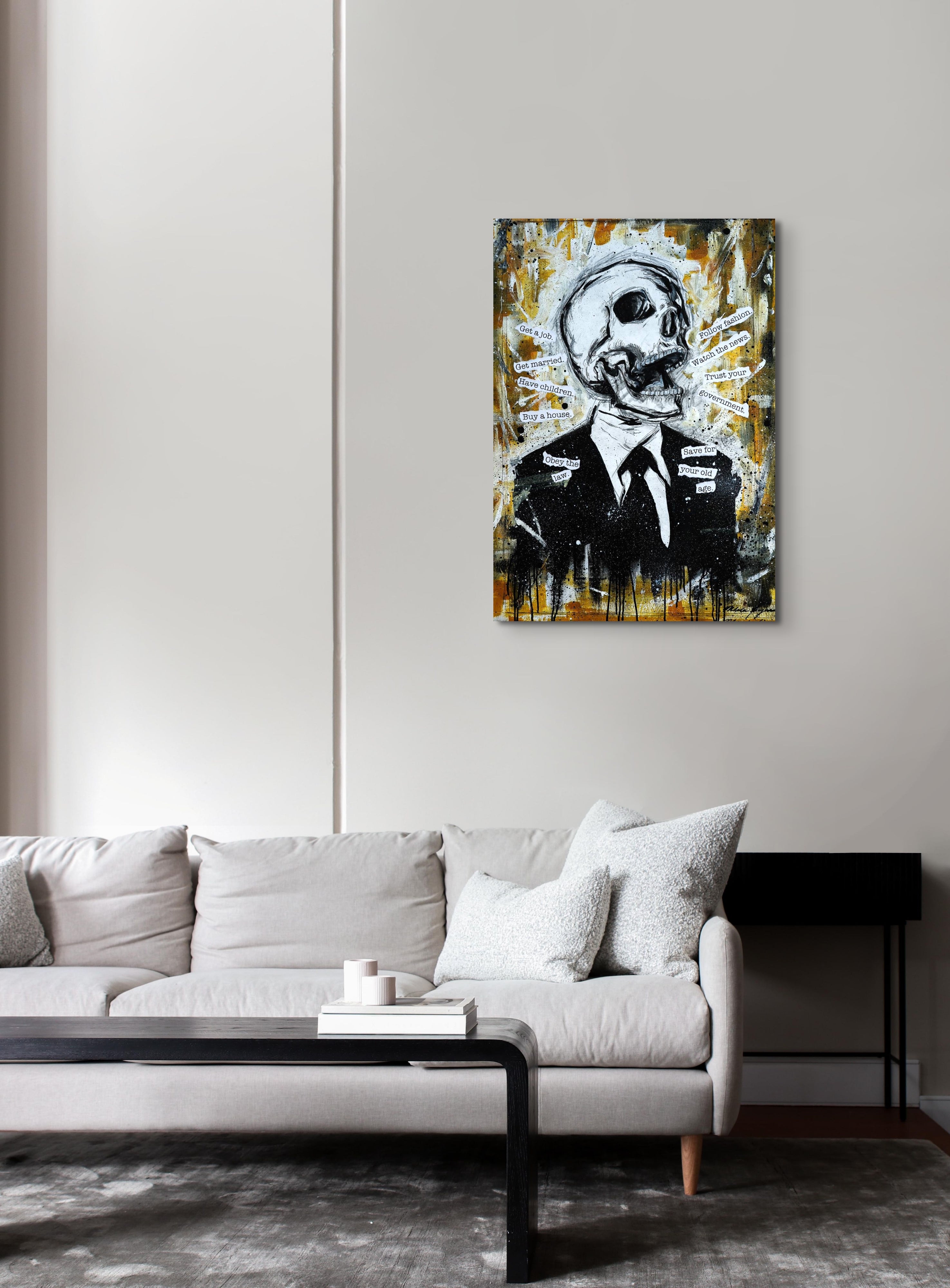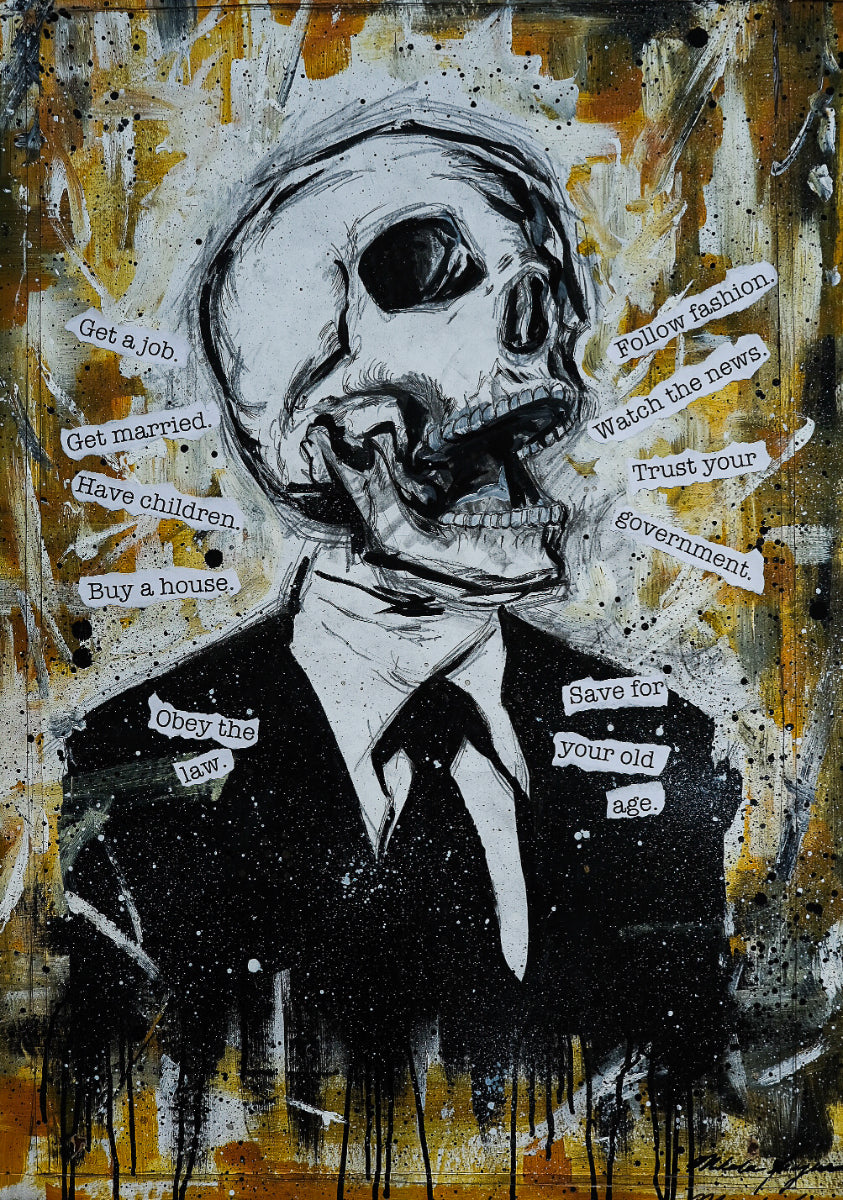 This piece dares the audience to discard the external conditionings of the status quo, along with everything one is conditioned to believe in and be co-dependant on. Teague wants to counter how the sum of an individual’s "worth" in society is determined by their financial status, job, age, gender, sexuality and appearance. This work pushes the narrative of happiness being related to the inner self; rather than related to physicality and labels. Teague asks viewers to "raise your consciousness - your personal happiness, success, emotions and purpose in this lifetime is an entirely personal and individual journey" and to "leave a positive rebellious impact, and for god’s sake, live passionately with wild abandonment."