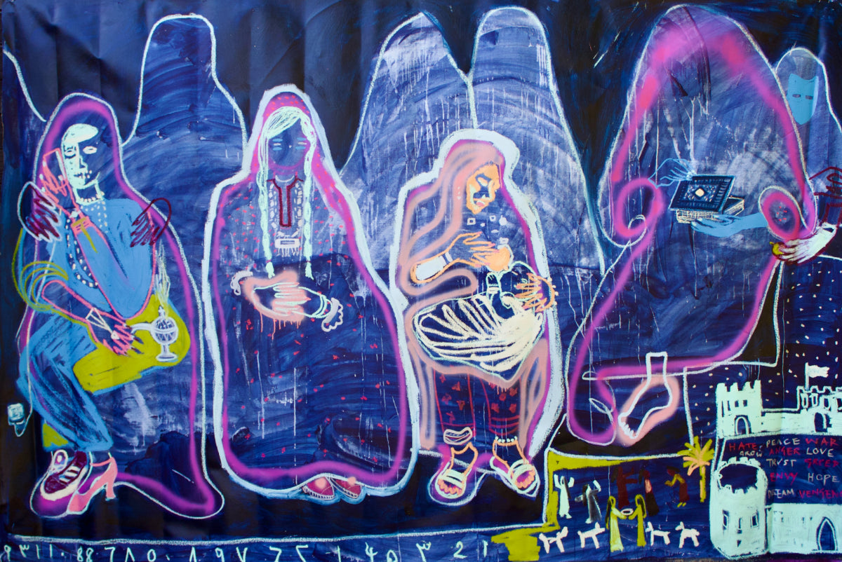 "Through painting, I challenge the perceptions of my existence: brown skin from my father and white skin from my mother. I am mending all the broken umbilical cords of DNA, separated by time, land and mispronounced vowels, completing me, even in my fragmentation." -Latifah Stranack