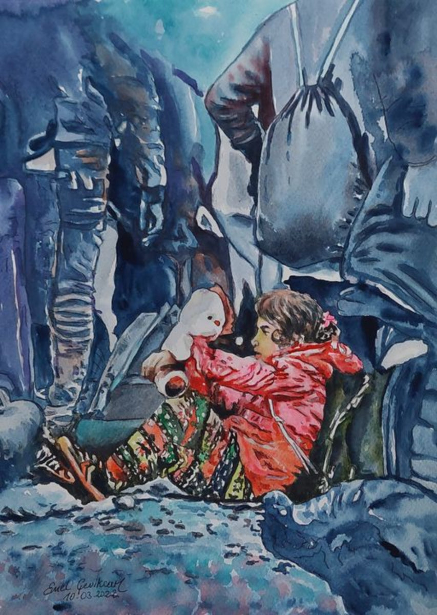 This watercolour work is fascinating in its focused composition. Drawing attention to the young girl both spatially and in its colour, Çevikcan guides necessary attention to the child's position within spaces of war and migration. The child encompasses a strikingly juxtaposing sense of both agency and innocence, allowing viewers to feel a sense of responsibility. Çevikcan accompanies this piece with the following text: "Thinking about all the innocence and suffering of children in this official world, I tried to reflect the picture of pain with the thought that all the circles of power that put them in this difficult situation will one day writhe in their shame. Children...we are all responsible for childhood."