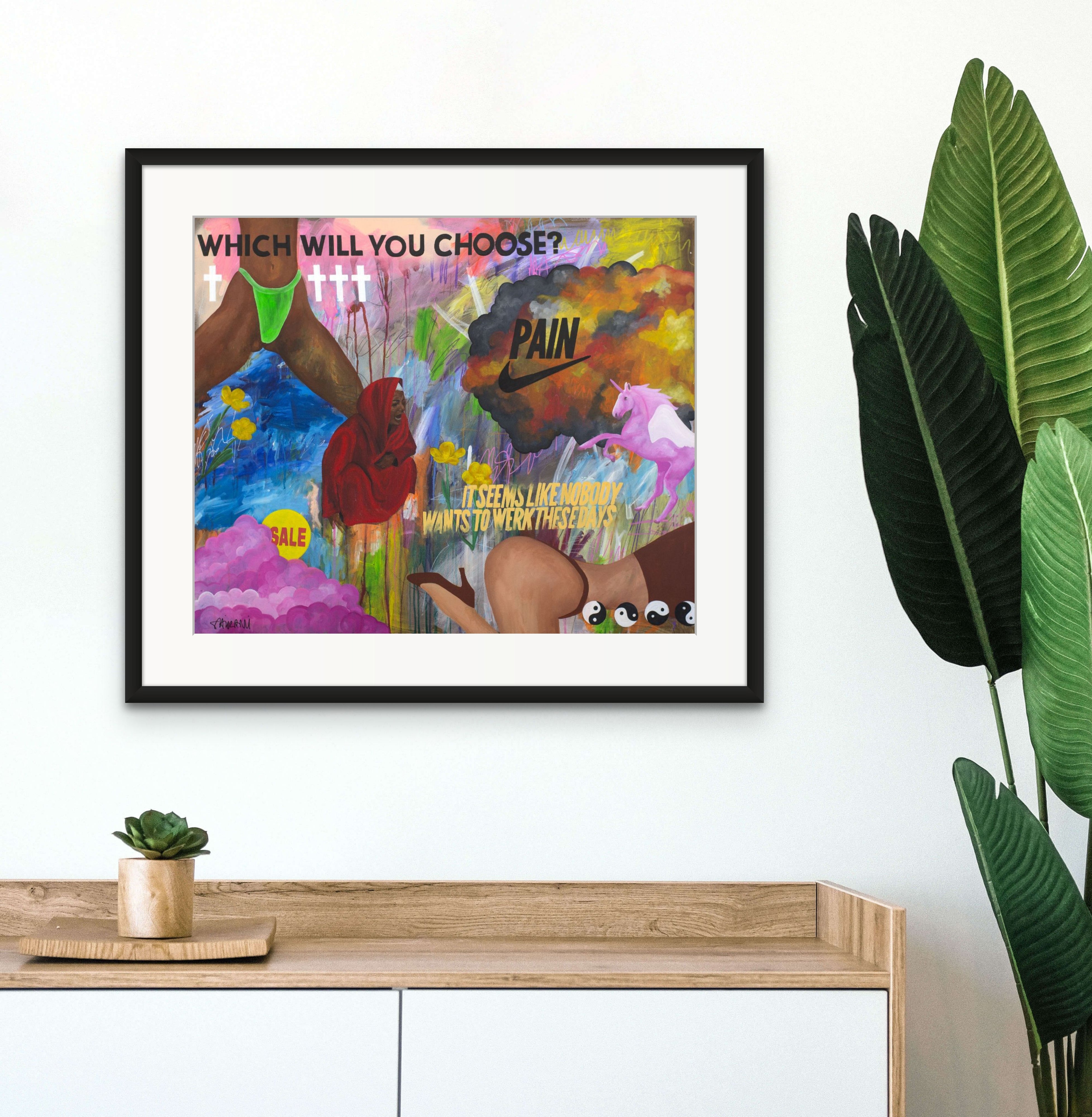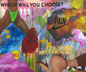Shopping, and particularly fast fashion, can be used in today's society to numb the parts of individuals that feel painful. In order to create this fleeting sense of happiness, one contributes to enormous pain outside of themselves by perpetuating, what the artist calls, a silent violence. Bolle accompanies this artwork with the questions: "If in fact we are all one, meaning if we are part of the same energy, or God, or whatever you choose to call it, then are we destined for this kind of self harm? Is it a way of killing the pain of existence itself? Much like the way that if you stop and really contemplate the idea of dying and being nothing at all, the fear can make you want to die?"