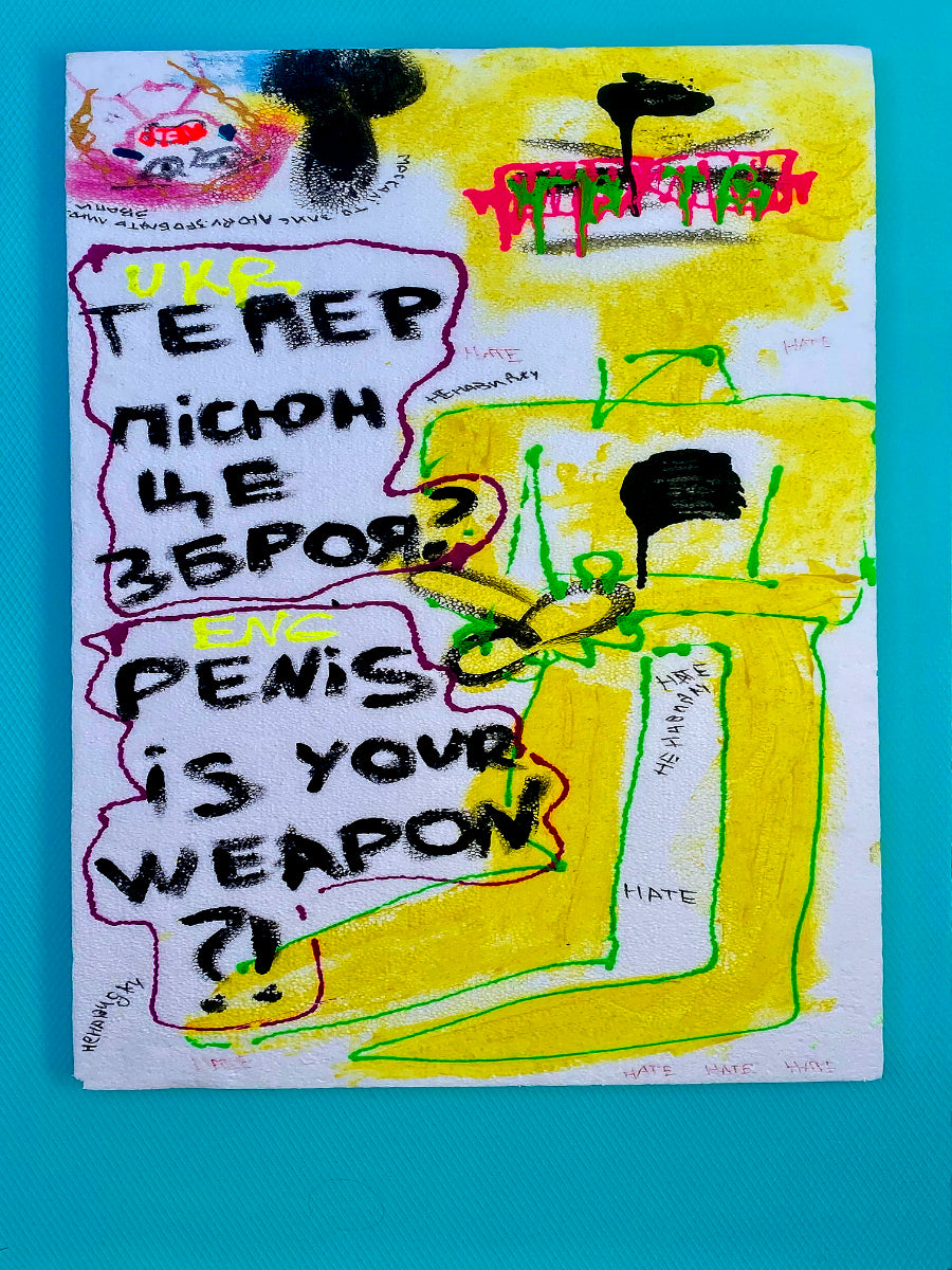 This painting discusses the terrible acts committed by Russian soldiers to Ukrainian children during the Russo-Ukrainian War. Referring to their 'penis as a weapon' is strong imagery that works alongside the visuals. Oliferovych highlights the need to remember this fact, pointing to phallic references to emphasise the lack of 'brains' that would push an individual to commit such an act.