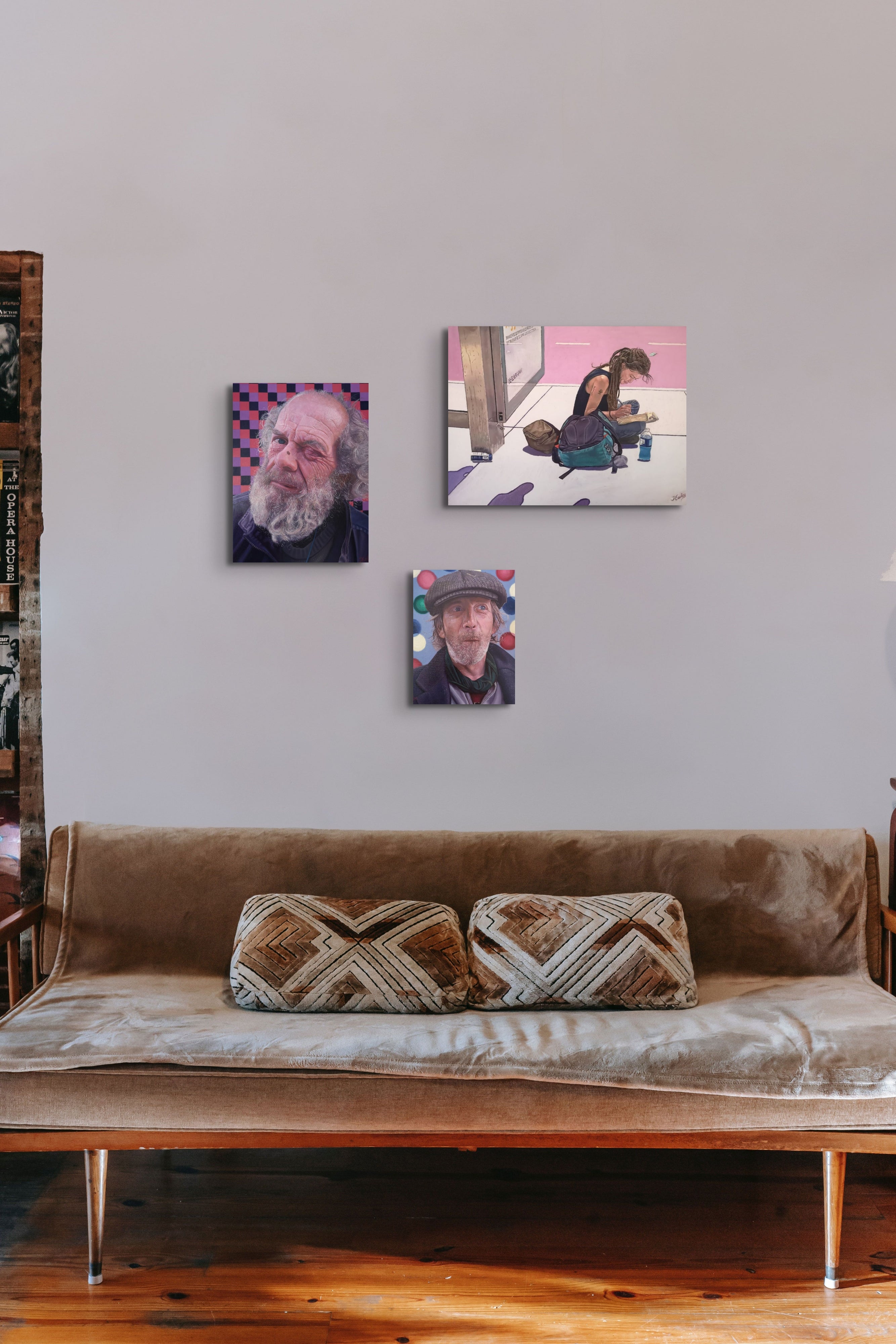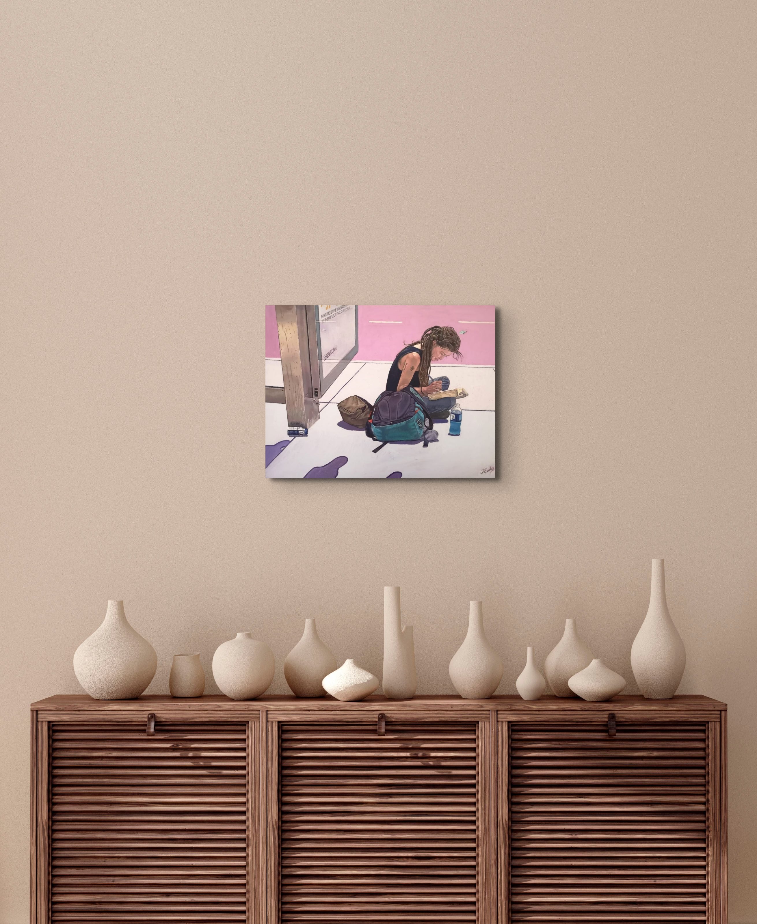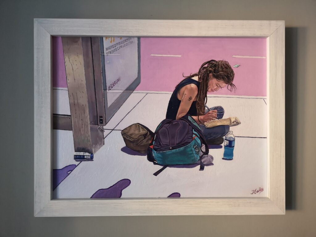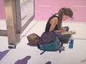“Alone In New York” is an original oil painting. The subject is a homeless lady who is sitting by a bus stop in New York. The world moves so fast around her whilst she sits in silence and reads a book whilst making notes at the same time. Like so many of the homeless she has a story to tell. I have met so many homeless people who see the cold and lonely streets as an escape from their home, their abuse and their trauma. I wondered what she was writing. I thought of her dreams as a child, and the injustice that these dreams were stolen from her. I added the shadows in the foreground as a sign of threat, uncertainty and fear that the homeless constantly have to endure. I want to thank the brilliant photographer Rob Sternitzky whose photo I referenced for this painting.
