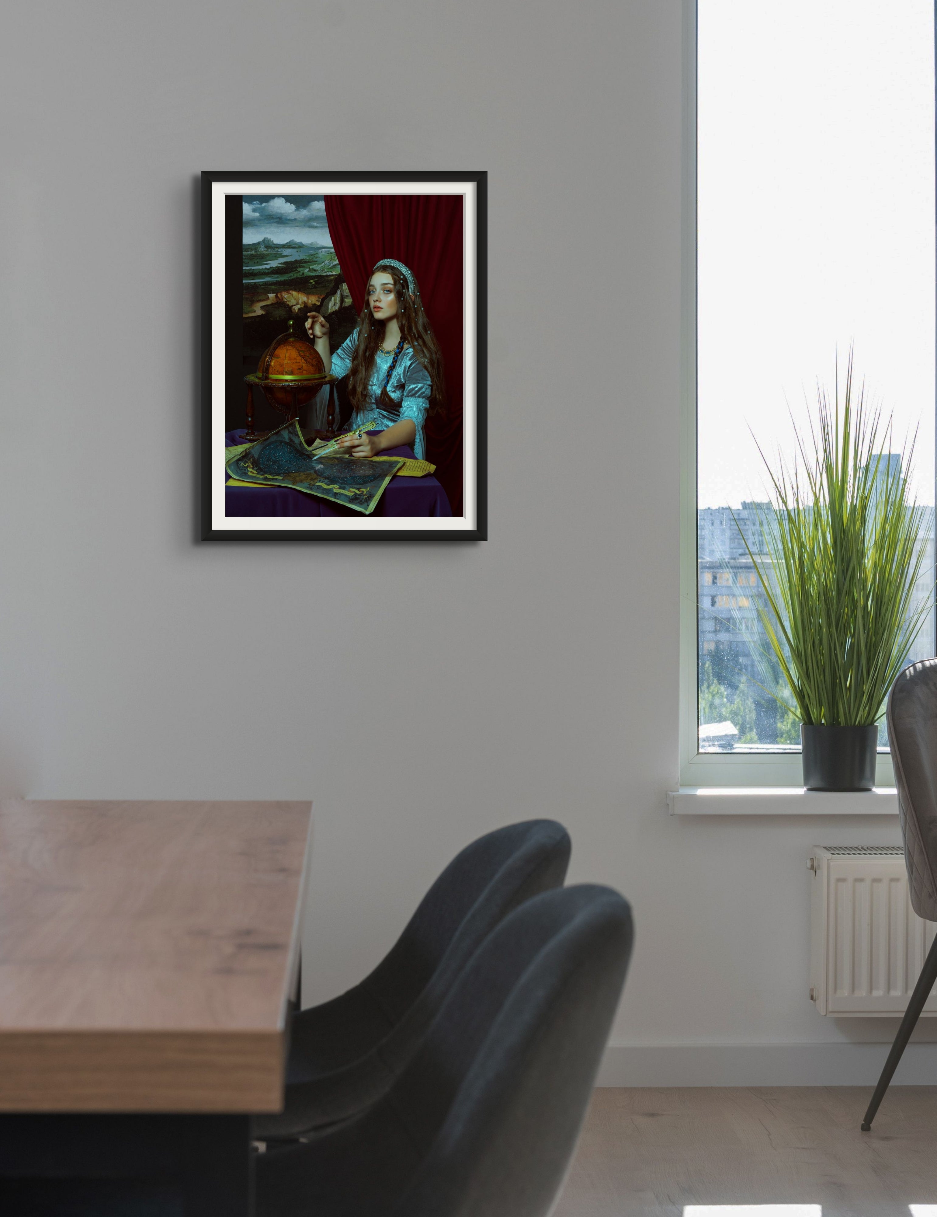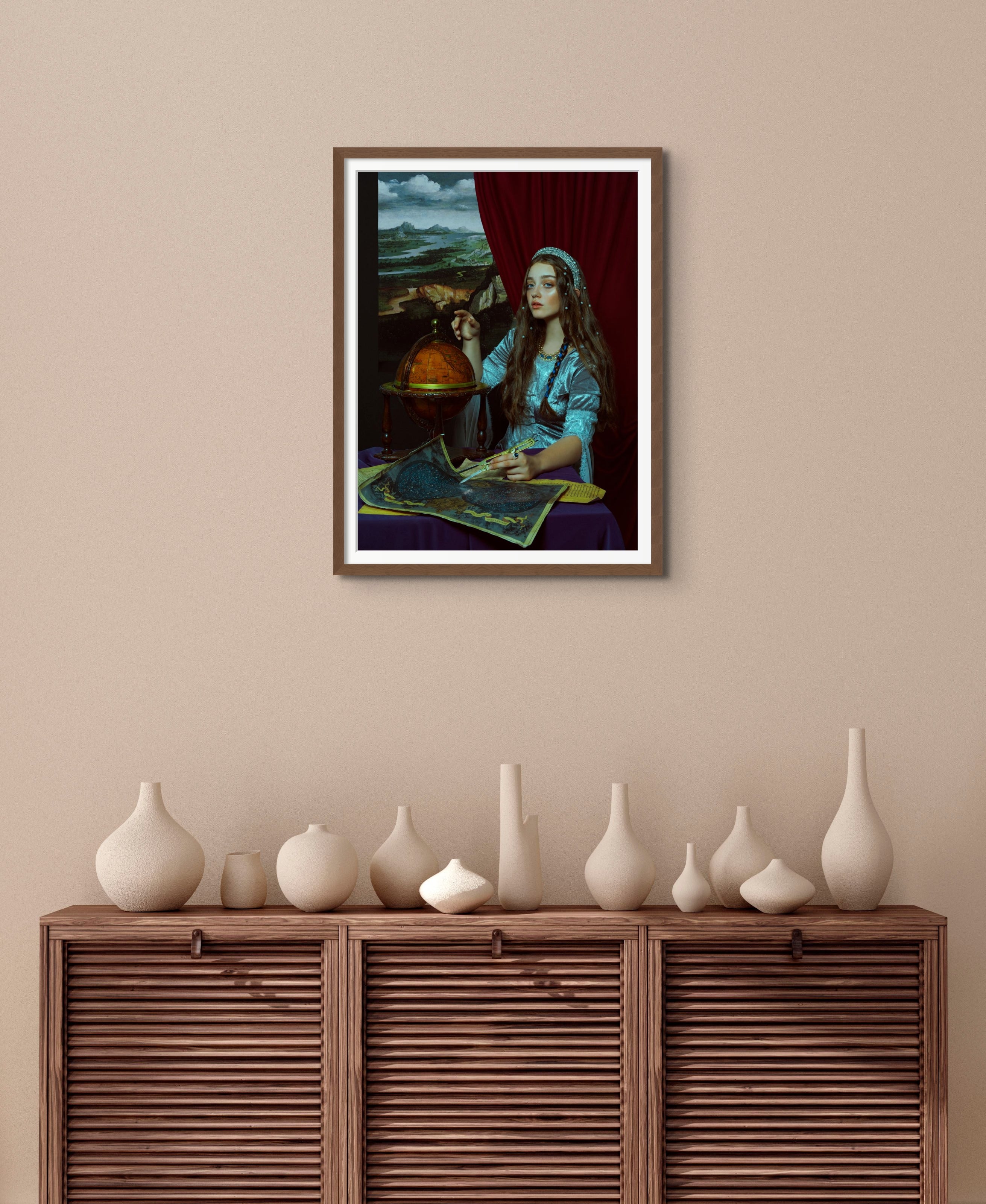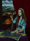 Inspired by the famous Vermeer's painting with the same name, the Astronomer shows a woman with a map and a world glove imitating the Renaissance Italian pictorial style. Vive's shot seeks to display the female figure beyond that of which typically represented within art; rather than passive and objectified, the objects surrounding her cite the figure as worldly, intelligent and assertive.