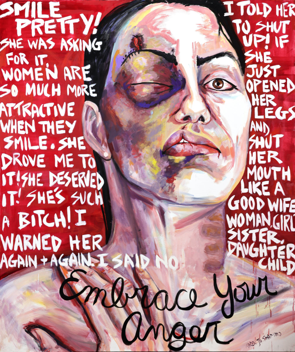 Smile Pretty depicts a phrase so many women and girls have heard all their lives, despite the onslaught of sexual, physical, and emotional violations they endure. The text behind this woman includes some of the phrases women endure on a daily basis. The painting textually and visually pushes the need for society to reach gender equity. Referencing public and private harassment and violence, Shapiro renders a striking image that will be found to be both parts shocking and relatable.