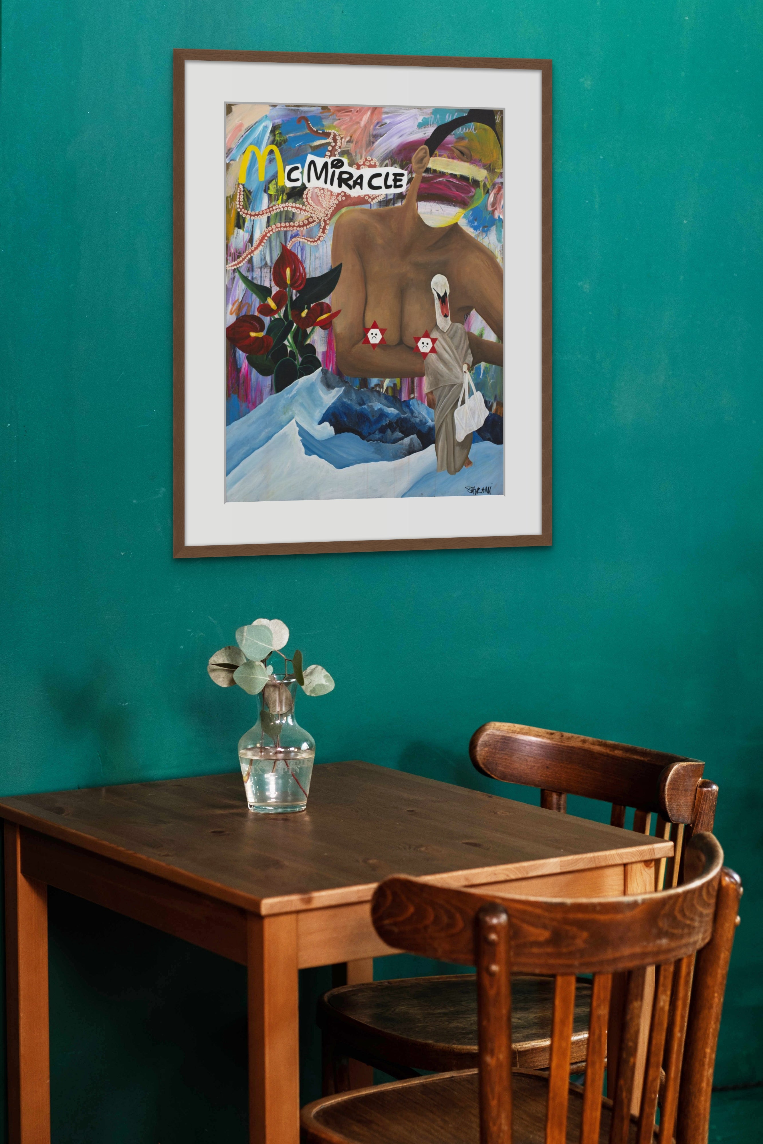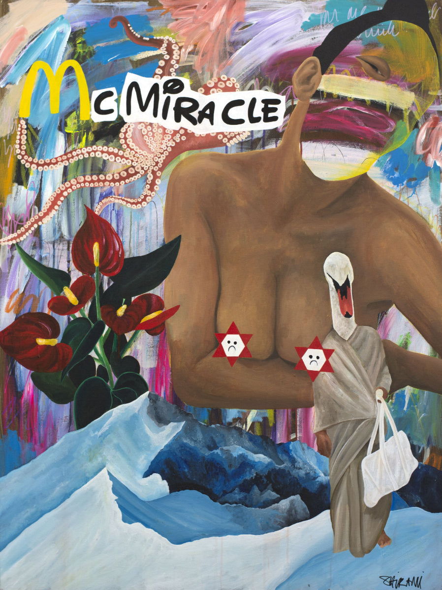 London born multi-disciplinary artist Shirani Bolle is the daughter of a Holocaust survivor and a Sri Lankan immigrant; it is the unlikely union of these two backgrounds that has heavily influenced her work. Bolle uses subjects such as war, capitalism, racism, religion and nature, alongside more personal themes, to explore the existential questions on identity and meaning. The artist's work protests against the, often unquestioned, structures of society. Bright, graphic and colourful, they create noisy and brash work that is demonstrative of the deafening, seemingly inescapable society that we have built. Bolle is visually optimistic in her unravelling of the conscious human existence. She combines her art with a knowledge of eastern philosophy to render open-ended questions; of which, society usually suffers from ignoring.