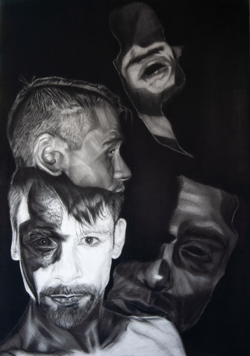 freely in the art world - exploring a variety of mediums for expression, switching between abstract and figurative. He uses self-portraits to form a raw, authentic and powerful biography. Delson surveys and powerfully expresses his mental state which works simultaneously: as a solution to solve his mental health issues and to create a connection to the outside world.