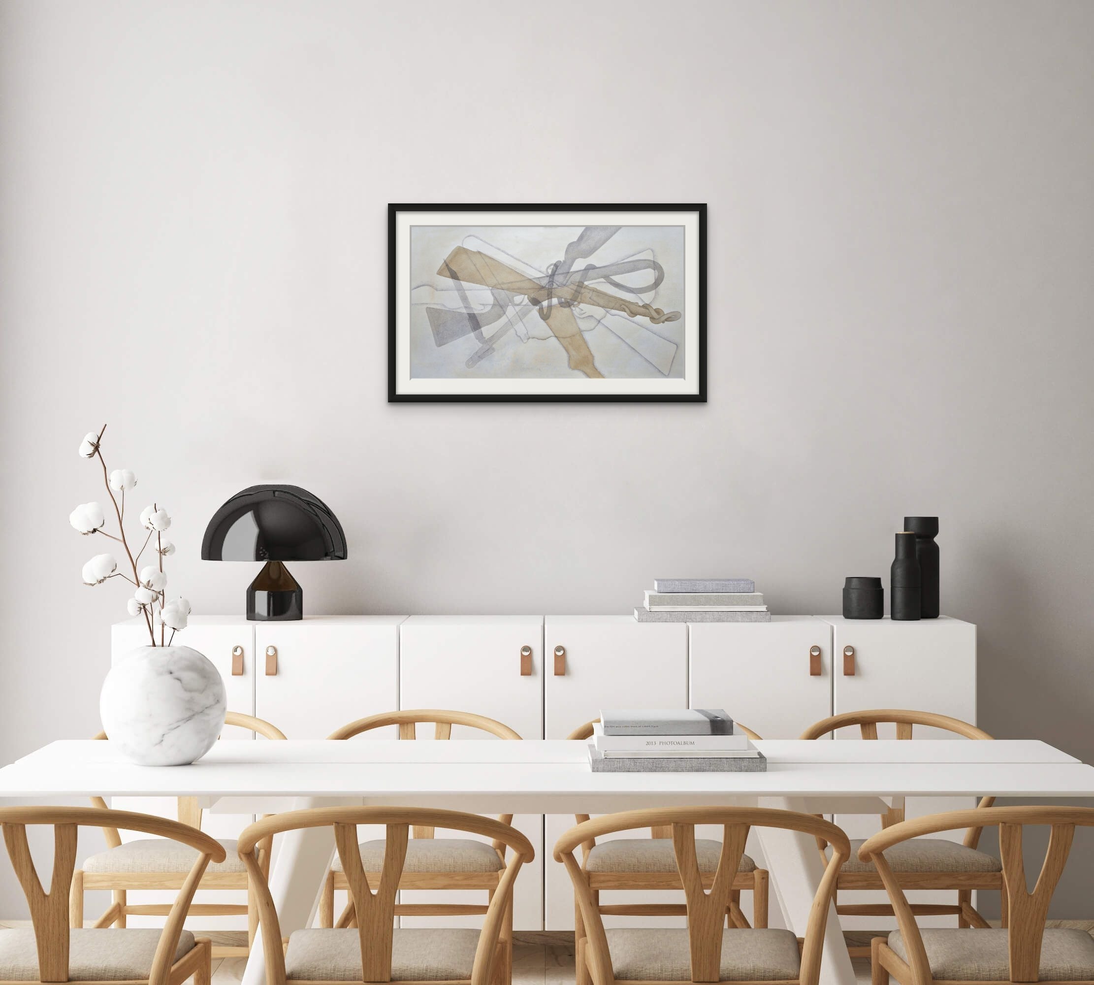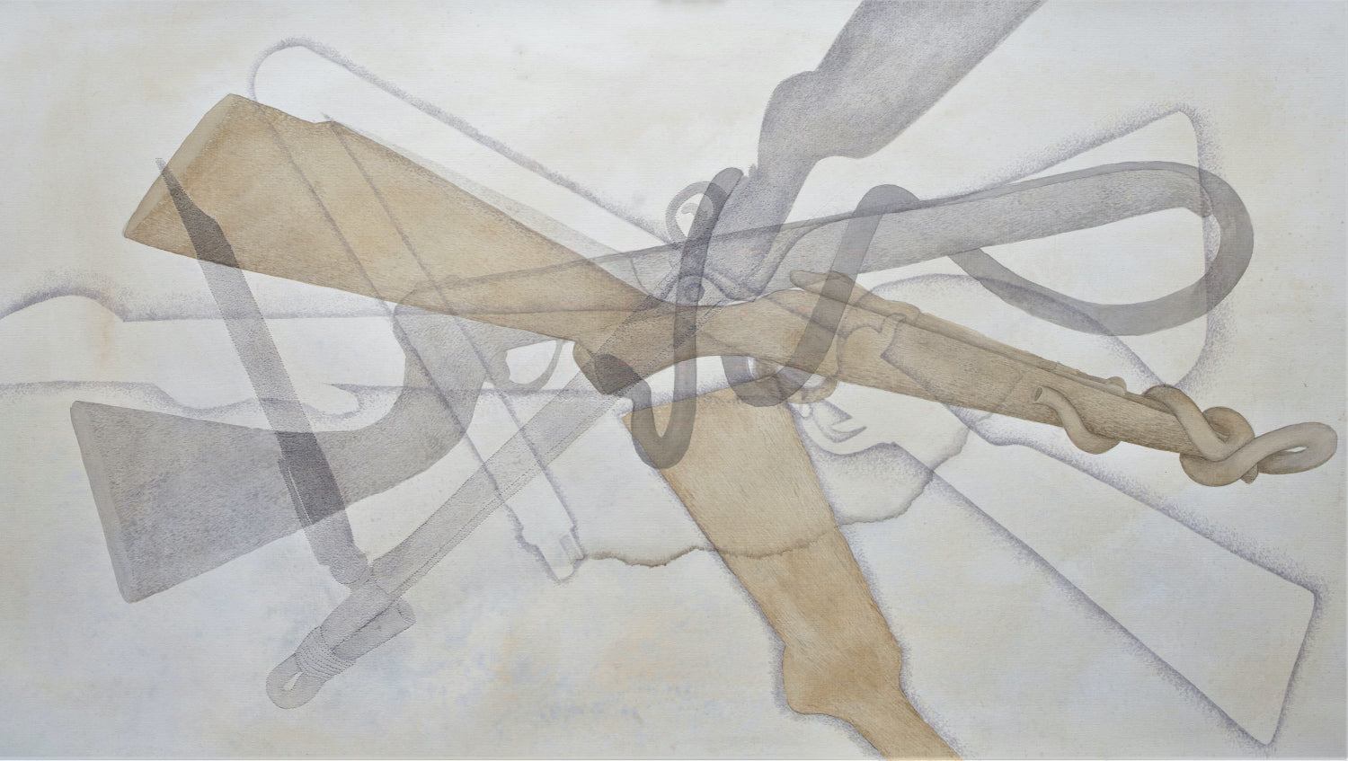 Kausar Iqbal's Gun Series paintings explore the presence of violence within society. Using guns as a motif, the artist either hides the component in plain sight or covertly to represent the cultural mechanisms of society. Kausar describes his work as a "realistic visualisation of the truth," commenting on his "traditional background and featuring the practice of arms and ammunition with its negative impacts."